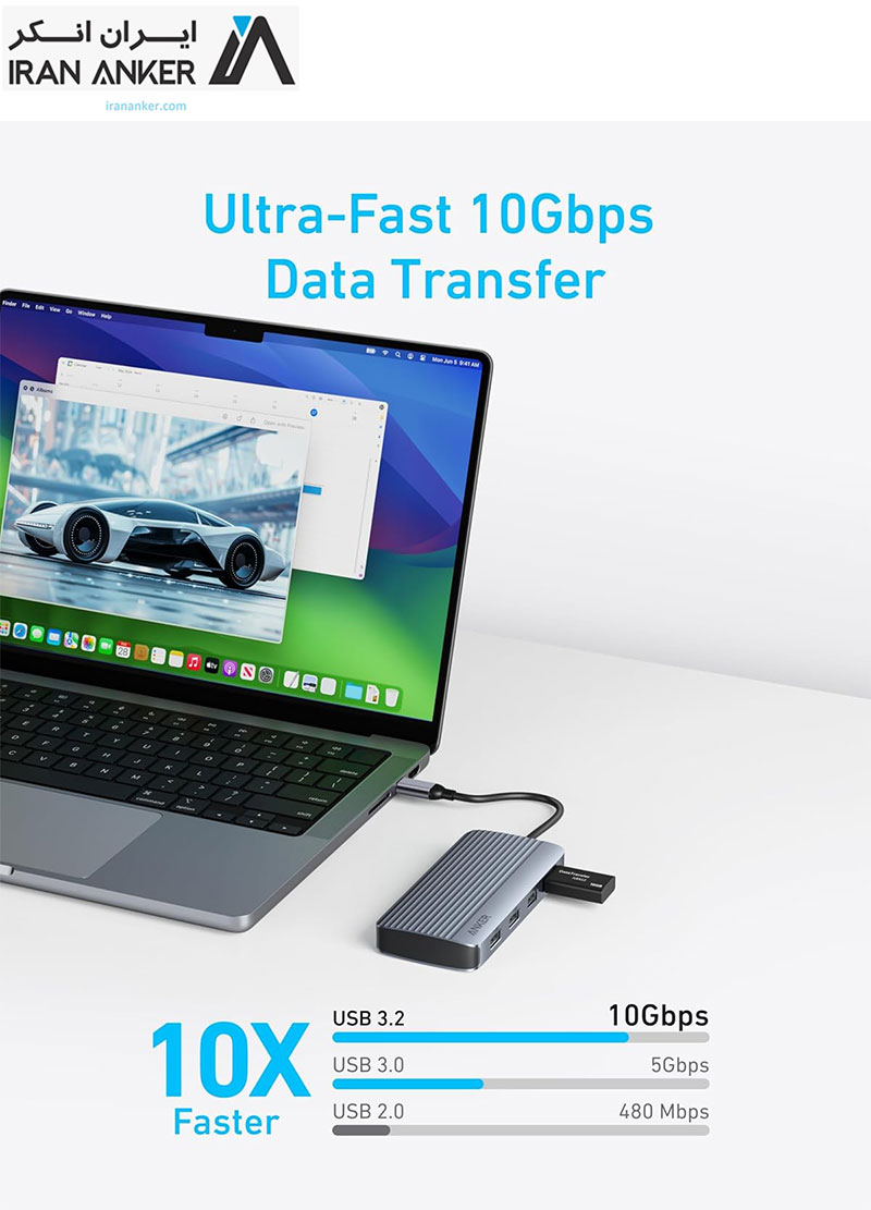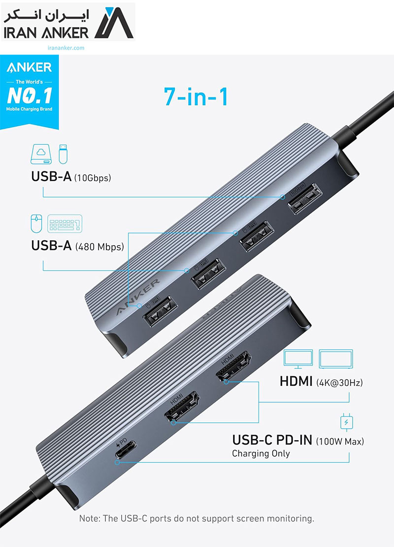 Anker A8374 یک هاب USB-C با 7 درگاه (7-in-1) است که از طریق پورت USB-C به لپتاپ یا دستگاه شما متصل میشود و امکانات بیشتری مثل پورتهای USB، خروجی تصویر و شارژ را اضافه میکند.