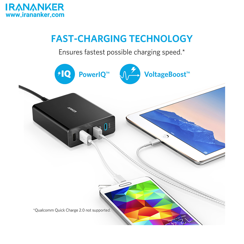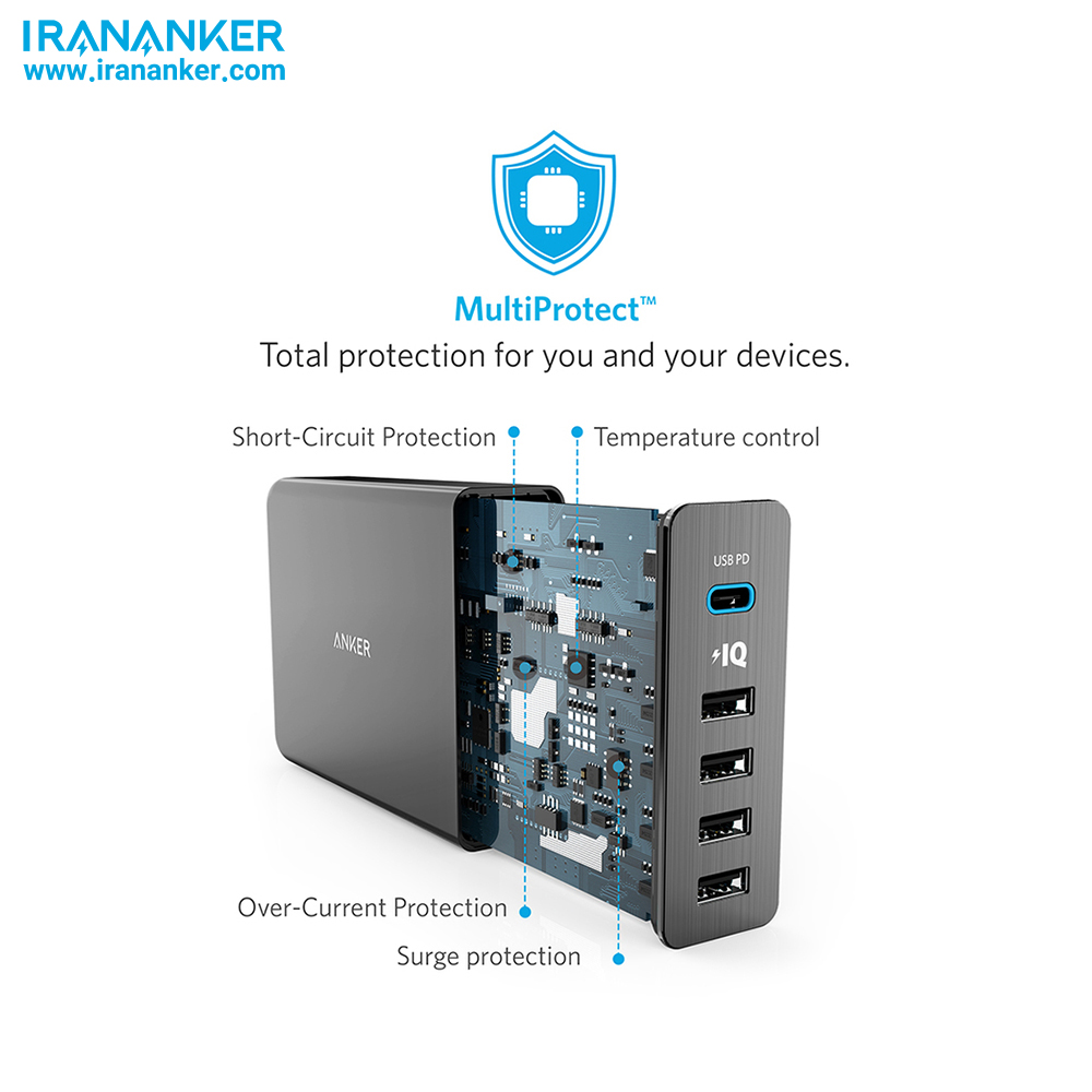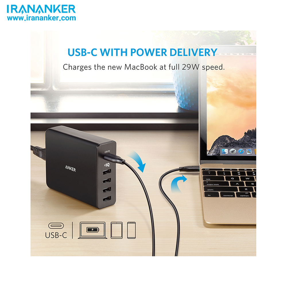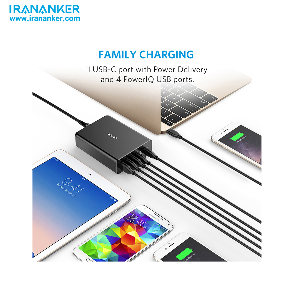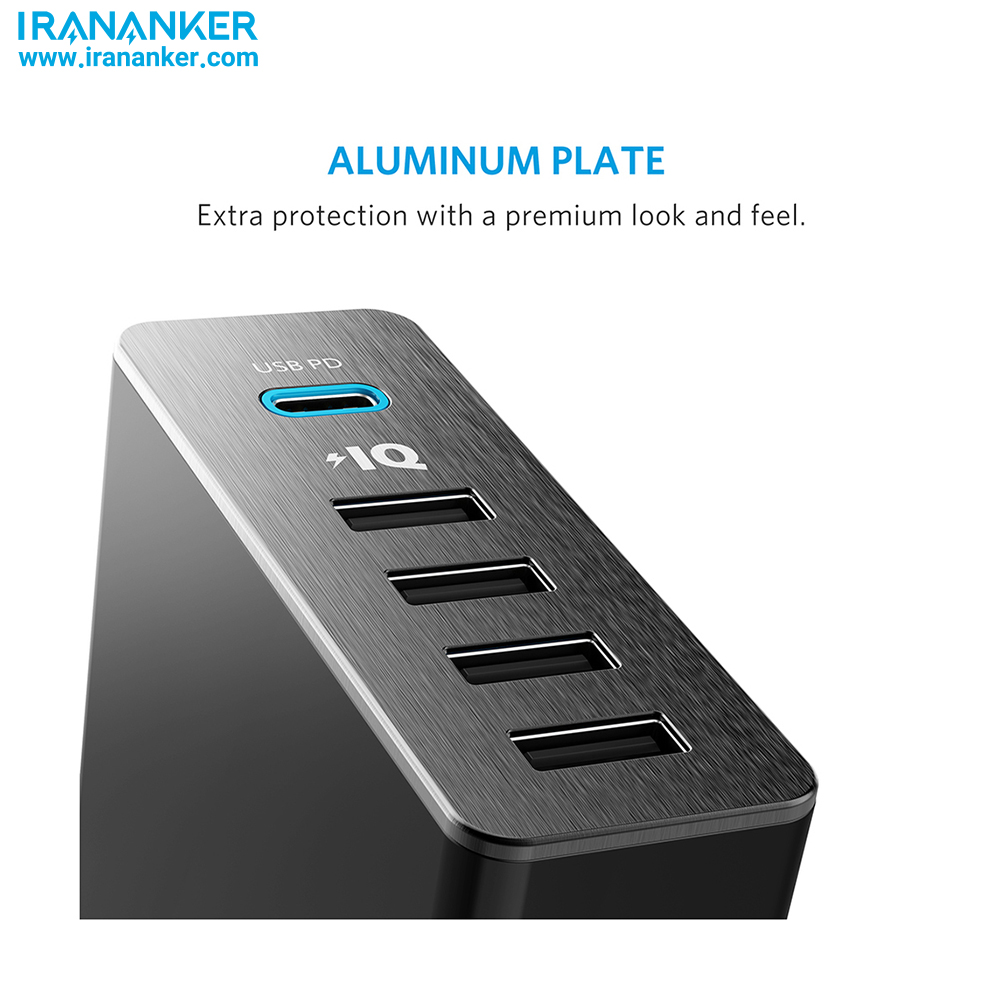 شارژر ۵ پورت به همراه تکنولوژی PD به بالاترین میزان کارایی در سرعت شارژ را در اختیار شما قرار خواهد داد. این شارژر رو میزی امکان شارژ همزمان ۵ دستگاه ، تمامی تلفن های همراه هوشمند ، تبلت و مک بوک را دارد. از سیستم مدیریت شارژ هوشمند IQ بهره میبرد.