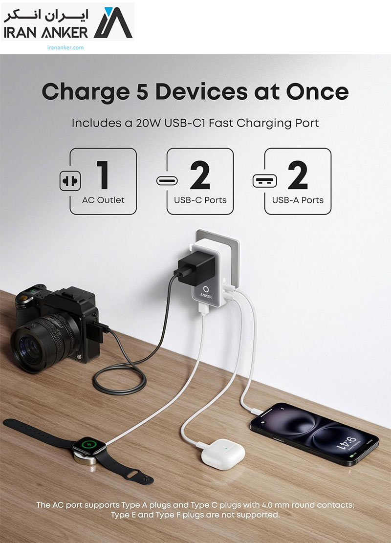 🔄 این شارژر برای شارژ هم‌زمان تا پنج دستگاه مختلف طراحی شده است و با انواع دستگاه‌های USB-C و USB-A از برندهای مختلف سازگار است.