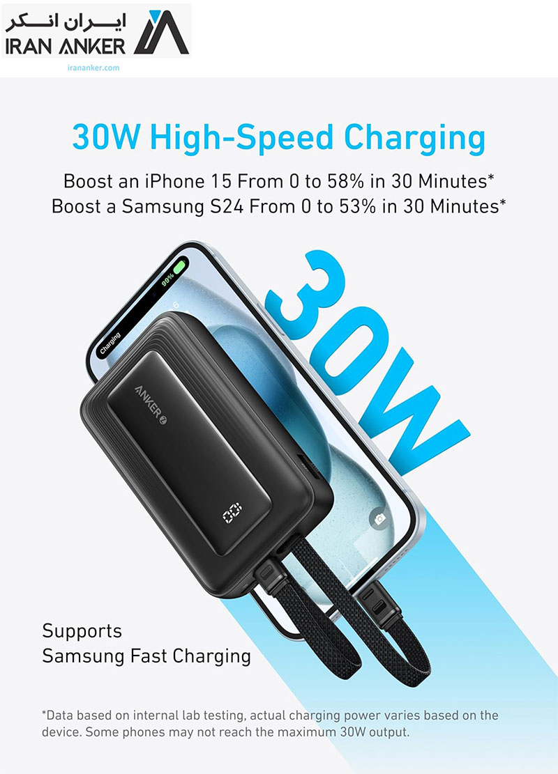 پاوربانک 30 واتی انکر با ظرفیت 10000 میلی آمپر Anker Zolo Power Bank Built-in USB-C and Lightning Cable مدل A1680