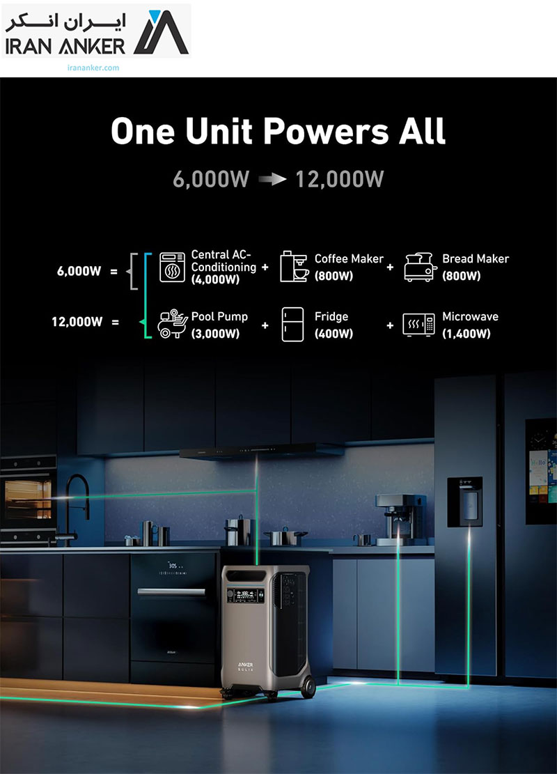 Anker SOLIX F3800 یکی از قویترین پاوراستیشنهای پرتابل دنیا است که برای مصارف خانگی، سفر، کمپینگ، RV، کارهای صنعتی، تجهیزات پرمصرف و حتی شارژ خودروهای برقی طراحی شده است.